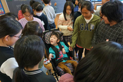 また、車椅子体験なども行い、3年生にとっては、実際に車椅子に乗ることで発表で聞いたことと体験したことが繋がり、福祉についてもより考えを深めることができたようです。