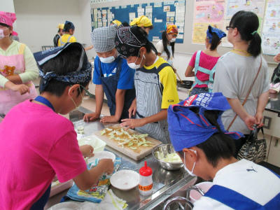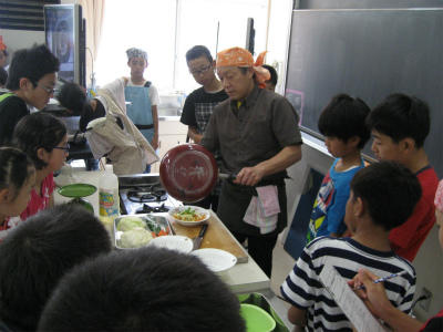 6年生の家庭科の授業に、プロの料理人「トキオのマスター」がゲストティチャーとして来て下さいました。野菜いためのコツを教えて頂きました。初めは自分たちだけで作ってみて、その後マスターのいため方を見せてもらいました。同じ材料なのに、見た目も味も違っていました。
