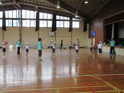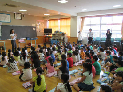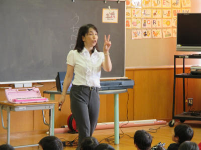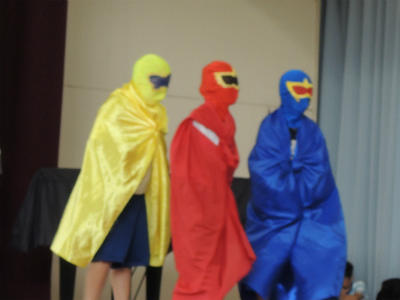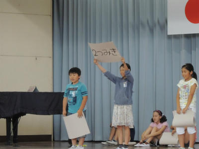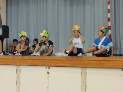 今日は、緑化委員会と集会委員会の発表がありました。「緑を守るんジャー」が登場し、花を大切にしてほしいと伝えました。集会委員会のゲームは、「言葉当てゲーム」といって一斉に言葉を言って考えるゲームでした。