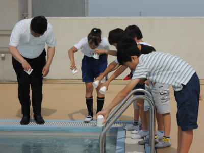 先週金曜日のプール開きに続き、いよいよプール学習が始まりました。午前中は水温が上がらず入れませんでしたが、午後からは水温・気温とも十分になり、5年生が一番乗り。元気な声が屋上のプールから聞こえました。