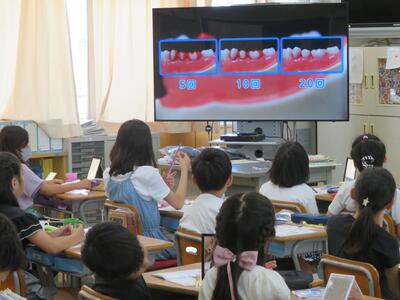 に4年生が参加しました。モニターを通じて、歯みがきの