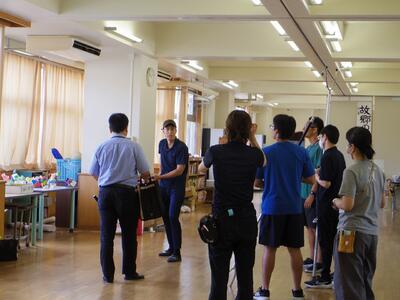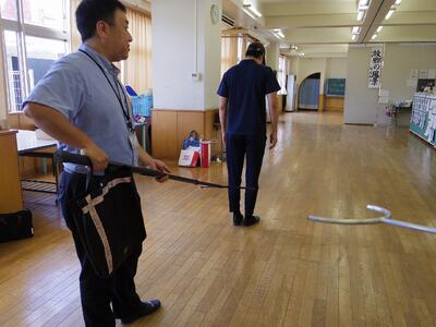 今日は、春日部警察の方を講師にお招きし、6年生のエリアに不審者が侵入したという想定で訓練を行いました。1~5年生はリモートで教室から様子を参観しました。
