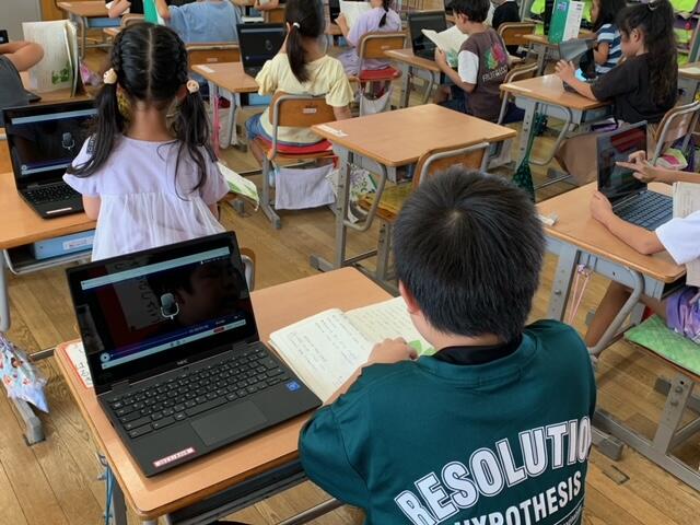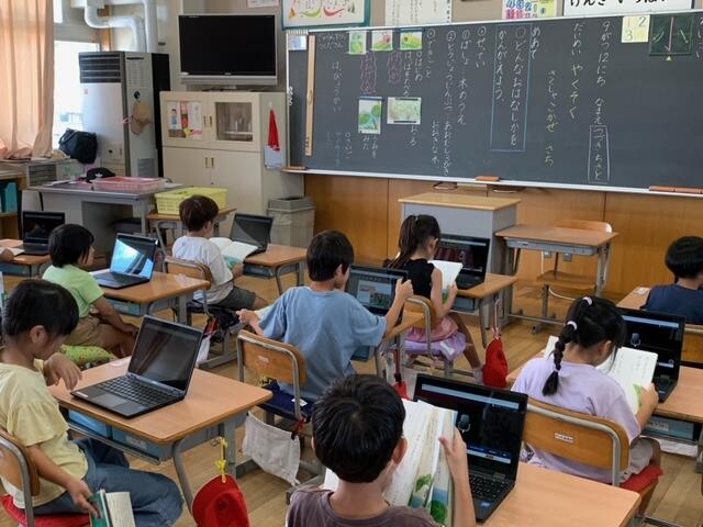 「やくそく」というお話を音読しています。一人一人、タブレットに音読を録音しています。