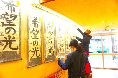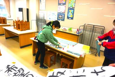 先日の校内書きぞめ展の特選作品や市内書きぞめ展(オンライン)に掲載された作品が展示さています。