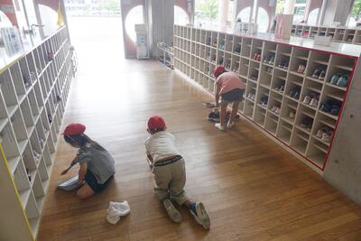 今回は、広々とした教室やオープンスペースを隅々まで雑巾がけ。