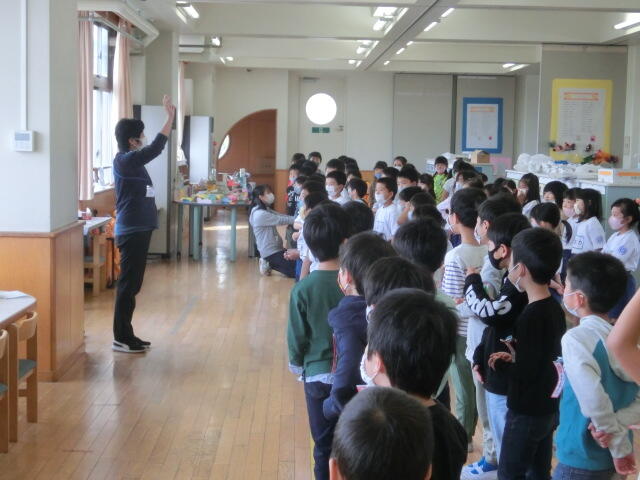 各学年がオープンスペースに集まって今月の歌「ありがとう」を歌いました。