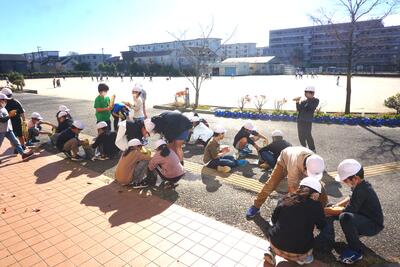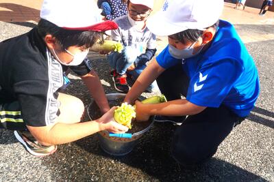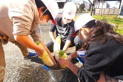6年生が収穫した大根を4年生が洗い、土を落としました。