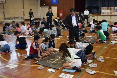 昨日のサッカーワールドカップの日本代表の選手のように集中して、札と向き合っている3年生。はじめての郷土かるたでしたが、楽しく取り組むことができたようです。