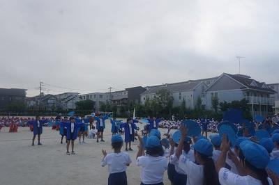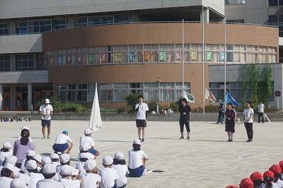 火曜日の朝、全体練習前に新しく赴任された先生と教育実習生が子供たちに紹介されました。
