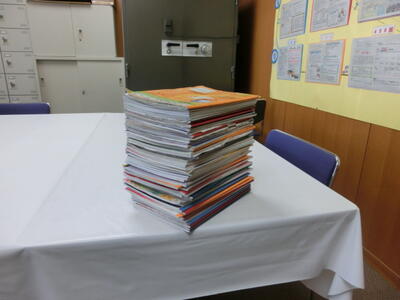 今日の業間休み、校長室には写真のようなノートのタワーができていました。