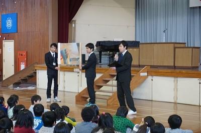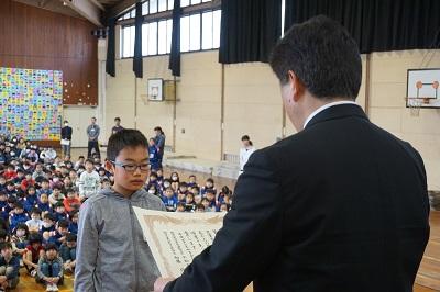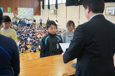表彰では、体育、図工、国語、家庭科関係で展覧会やコンクール、大会等で優秀な成績を修めた児童やクラスの表彰が行われました。