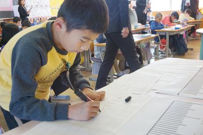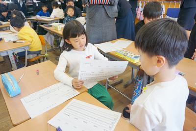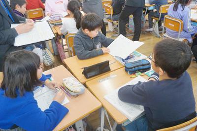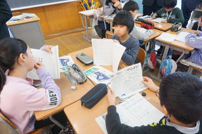 事前に交流の仕方をまとめたプリントを参考にしながら「質問ありますか?」など、算数科での交流の仕方で、よりよい自己表現を模索し、違った考えから共通することを見つけ、考えを深めていきました。