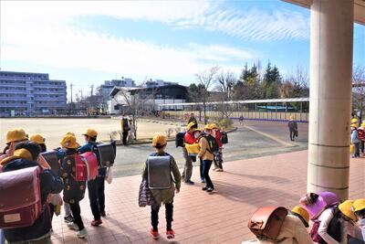 冬休みの生活や宿題についての話も終わり、下校の様子。