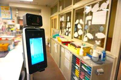 また、職員通用口のところに職員向けの体温センサーを設置しています。