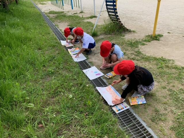 3時間目、1年生の図工の時間 紙とクレヨンを持って校庭に出ました。