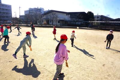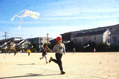 冬晴れのとある昼下がり、1年生が生活科の一環で、羽根つきや凧あげなどの昔ながらの正月遊びを体験しました。