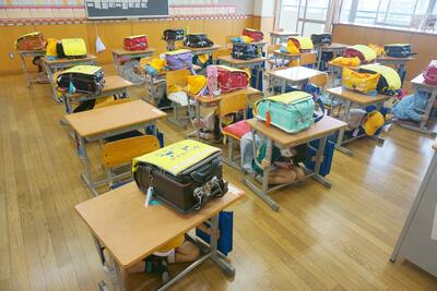 雨の中での開催ということで、防災頭巾の使用や校庭への避難はありませんでしたが、緊急地震速報の放送とともに、すばやく机の下へ隠れて揺れに対応することが出来ました。