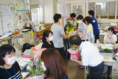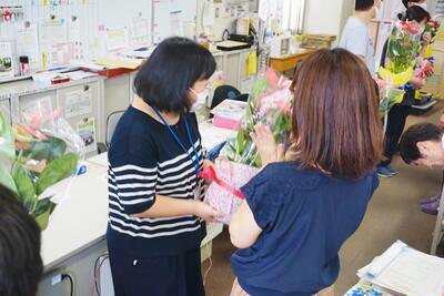 武里西小の先生たちの恒例行事である、新しく赴任された先生方への鉢花の贈呈が行われました。