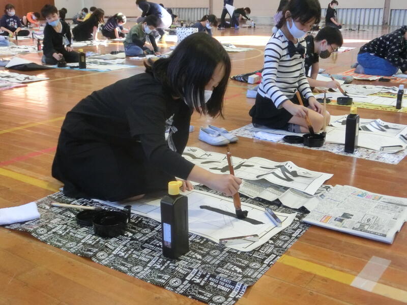 今日の5,6校時に野口勲先生を指導者にお招きして、3年生の書きぞめ指導がありました。