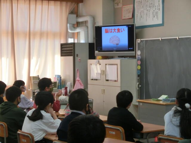 校長先生のお話は「朝ごはんの大切さ」についてでした。子供たちは、集中して見ていました。