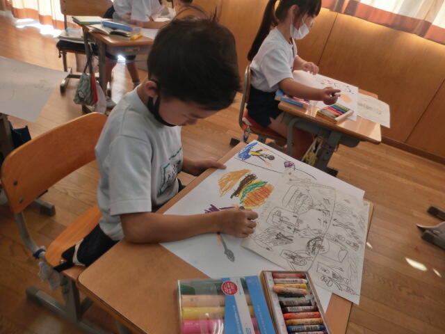 1年生の図工は「できたらいいな こんなこと」の絵を描いていました。