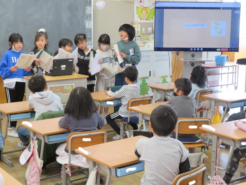 3年生は、国語で「姿をかえる大豆」という説明文の学習を行いました。その学習のまとめとして、1年生に向けた「大豆クイズ」を、タブレットを使って作りました。学んだことを整理し、1年生にもわかるように、楽しめるようにと考えてクイズを作りました。そして今日の3時間目、クイズを1年生に発表しました。1年生はとても楽しんでいましたね。よい学習のまとめとなりました、