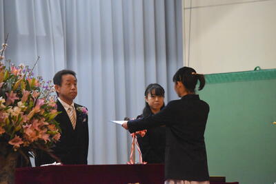 卒業証書授与。厳粛な雰囲気の中、卒業生は立派に堂々と証書を受け取りました。