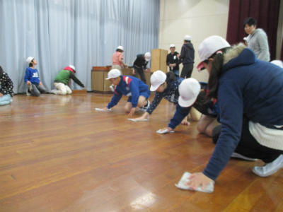 体育館の掃除を担当した委員会では、6年生を送る会や卒業式などに向けてアリーナに置いてある大型の用具を片づけたり、ステージの雑巾がけなどを行いました。