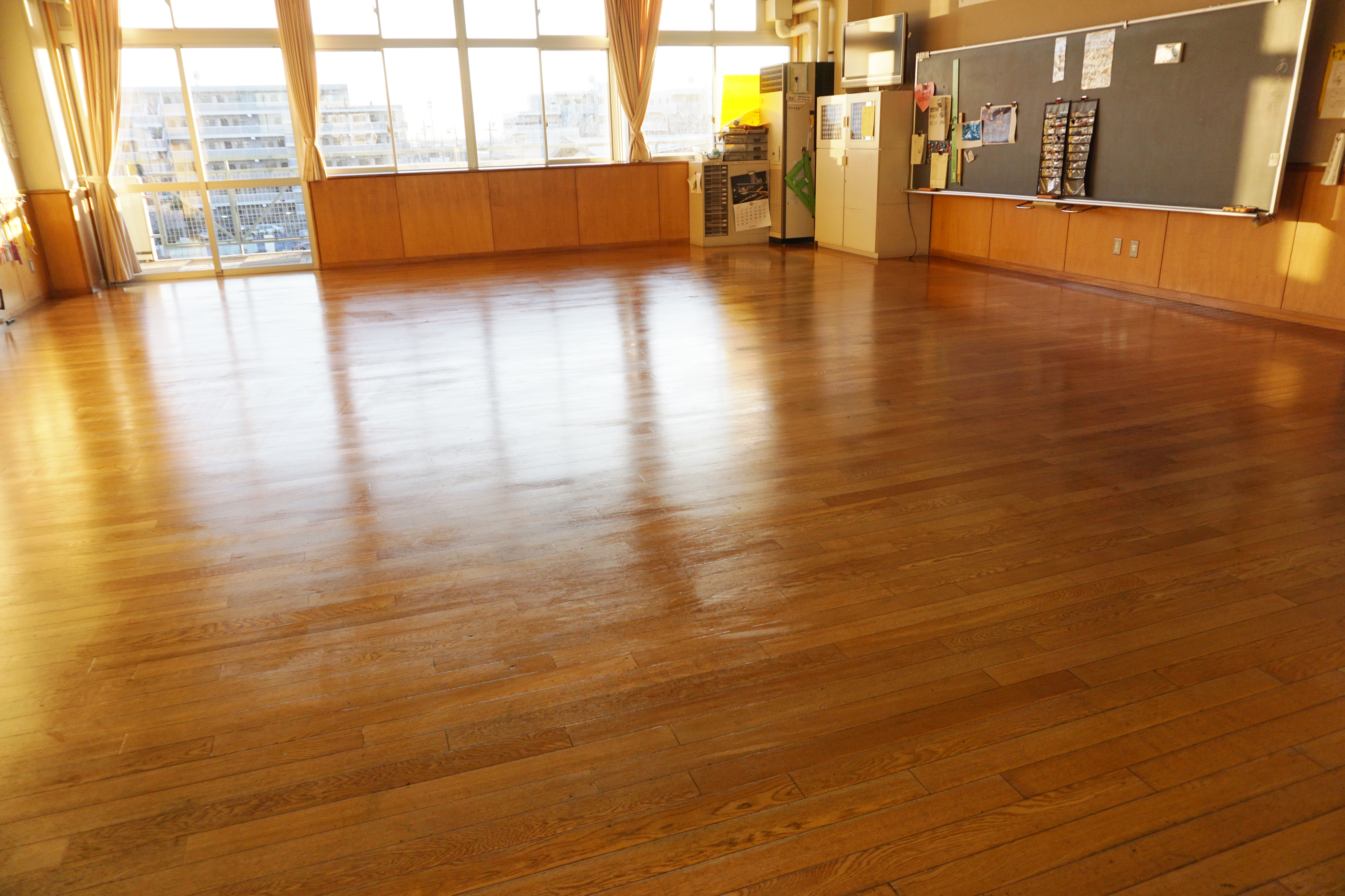 床もすっかりきれい。月曜は、机の中や残りの荷物を片付け、オープンスペースのワックスがけをして、大掃除は終了です。
