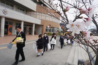 春分の日、卒業式を前にして、体育館脇のソメイヨシノの桜も花開き。開花宣言されました。