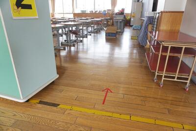 普段の教室の出入りは、後ろからのみとなっていますが、1年生の教室では、双方向の通行ではなく、入るときは前から、出るときは後ろからというふうに一方通行の矢印も設置しました。