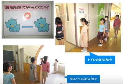 6月1日(月)の朝会で子供たちに見せる映像でも紹介しますが、トイレや手洗い場ではこのようにソーシャルディスタンスを保ちながら使用していきます。
