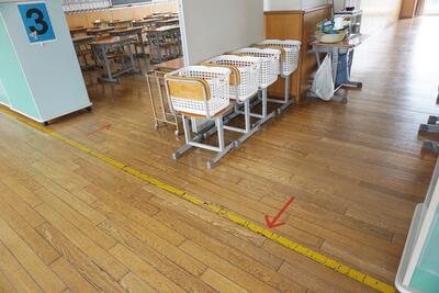 また、学校生活においても出来るだけ密集・密接にならず、ソーシャルディスタンスを保てるように先生たちが目印となるテープを貼っていきました。