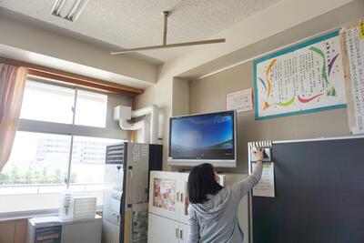 6月1日(月)の朝会でTV放映するコロナウィルス感染防止の指導のビデオについて、各教室で映るかのチェックも行われました。