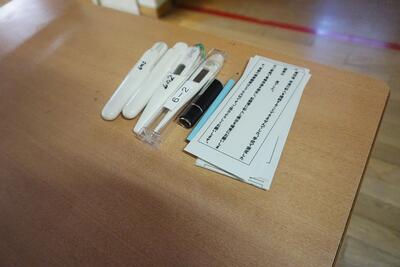 分散登校では、毎朝、教室に入る前に健康記録簿のチェックを行います。
