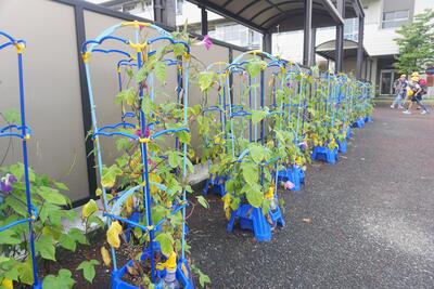 1年生のあさがお、2年生のミニトマト、3年生のホウセンカ…子供たちの鉢で育てた植物も大きく生長しました。