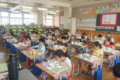 楽しみにしていた武里西小の美味しい給食に、子供たちのテンションも気温とともにあがっていましたが、2学期も引き続き、感染防止のために前を向いて、大声を出さず、もぐもぐタイムです。