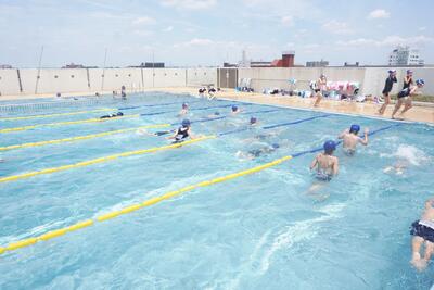 一方通行の流れるプールや、ボビング、カエルジャンプなどにチャレンジしました!