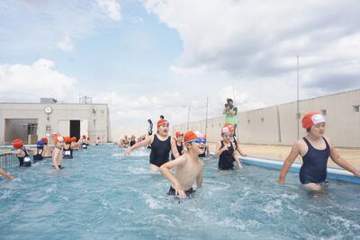 一方通行の流れるプールや、ボビング、カエルジャンプなどにチャレンジしました!