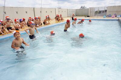 小学校生活初めての水泳学習を楽しんでいる1年生です。