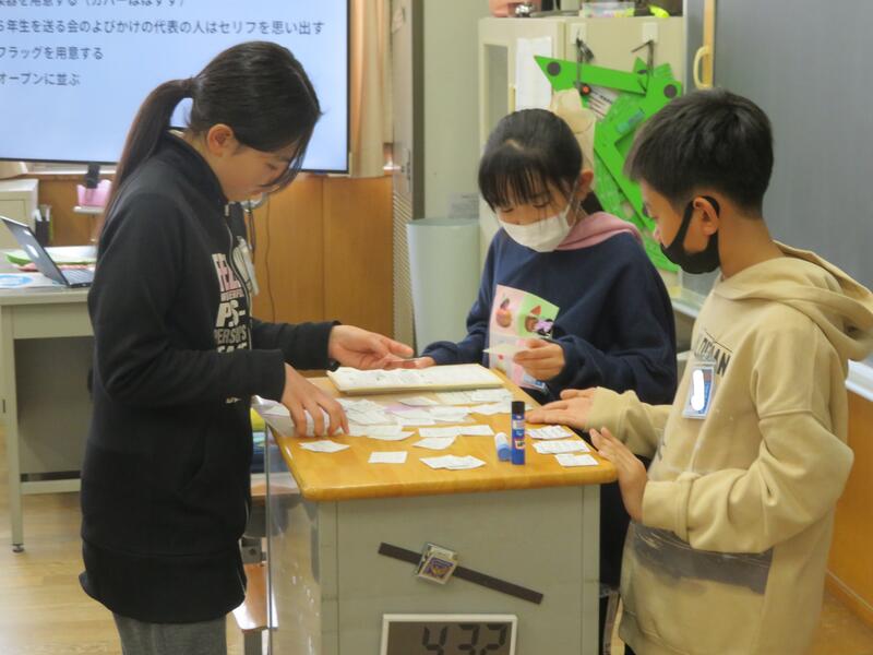 3月1日、6年生を送る会を実施する予定です。それに向けて、各学年が準備しています。朝の時間を使って、1年生や3年生が、6年生に届ける歌の練習をしていました。昼休みに行った武西タイムでは、1~5年生が集まり、感謝の色紙づくりをしました。どの学年も、感謝の気持ちを届けようと一生懸命です。6年生の皆さんが喜んでくれるといいですね。