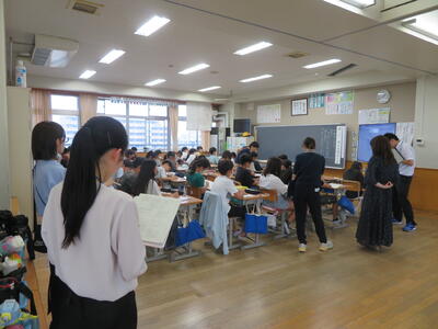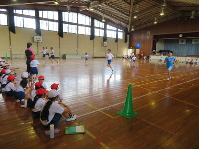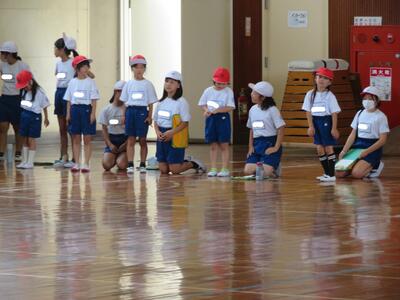 慣れない1年生には実施が難しいので、6年生がお手本を示したり