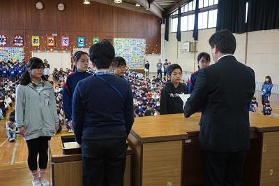 表彰では、体育、図工、国語、家庭科関係で展覧会やコンクール、大会等で優秀な成績を修めた児童やクラスの表彰が行われました。