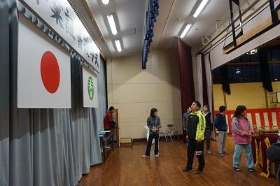 明日は予行ということもあり、前日には、紅白幕を張り、今日は、横看板や国旗、市旗、演台カバーなどを設置しました。