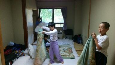 健康観察をして素早く布団の片付けに入っています!