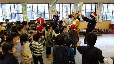 児童クラブでは、恒例のクリスマス会が行われ、そこにサプライズゲストとして、たけにしサンタと愉快な仲間たちが登場しました。