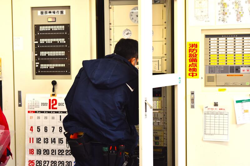 27日(火)には、夏休みに続いての火災報知器、防火シャッターなどの点検が行われました。