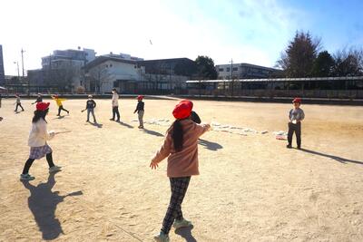 冬晴れのとある昼下がり、1年生が生活科の一環で、羽根つきや凧あげなどの昔ながらの正月遊びを体験しました。
