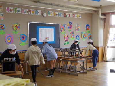 教職員もこの2日間、掃除や机の移動等を行いましたが、最後の仕上げを新6年生と一緒に行いました。