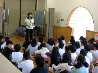 | ゲストティーチャーをお招きして、虫取りについて講義していただきました。 目の前で、大きなカブトムシを見せていただいて、大興奮!! (3年Tタイムより ) |